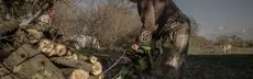 She prepares for winter on her own, cutting and stacking the firewood she’ll use to heat her home.
